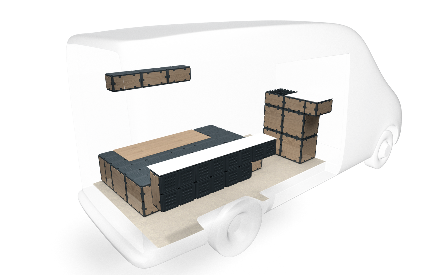 This is a suggestion for the layout in the van and light commercial vehicle category (e.g. Sprinter, Crafter, etc.). The arrangement and size of the furniture must be adapted depending on the make, model and equipment.