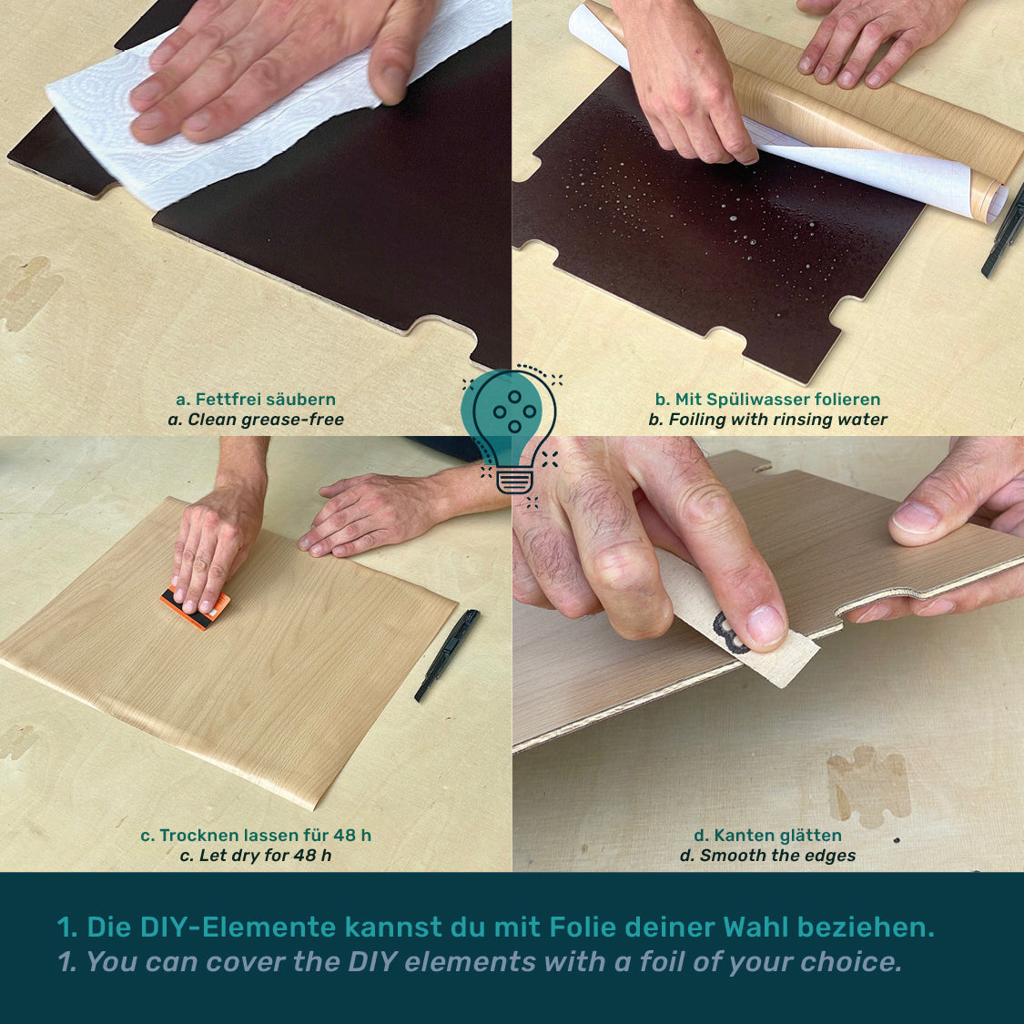Die Vertiefungen für die Verbinder sind bei diesen Dekorflächen bereits präzise vorgefräst, was das Einsetzen der Verbinder kinderleicht macht. Beachte bitte, dass die Verbinder bei dieser Variante nach dem Folieren selbst eingeklebt werden müssen. Apropos Folieren: Lass deiner Kreativität freien Lauf und gestalte deine Oberflächen genauso, wie du es dir vorstellst – mit einer Folie deiner Wahl!