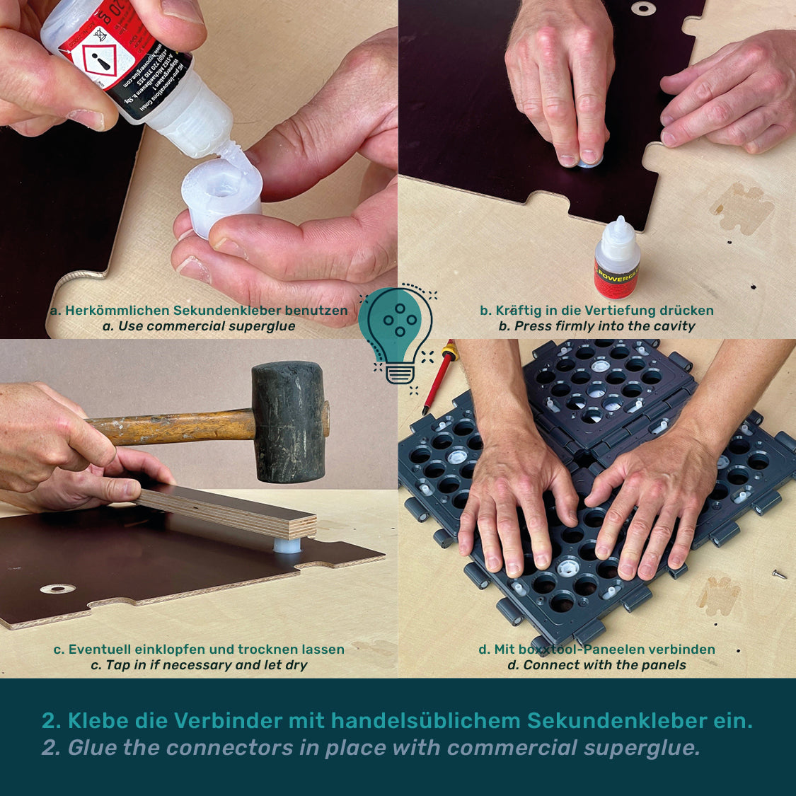Bitte beachte: Dekorfolie, der Kleber zum Einkleben der Verbinder, die Paneele (S20, R2040, S40) und das notwendige Werkzeug sind nicht im Lieferumfang enthalten.