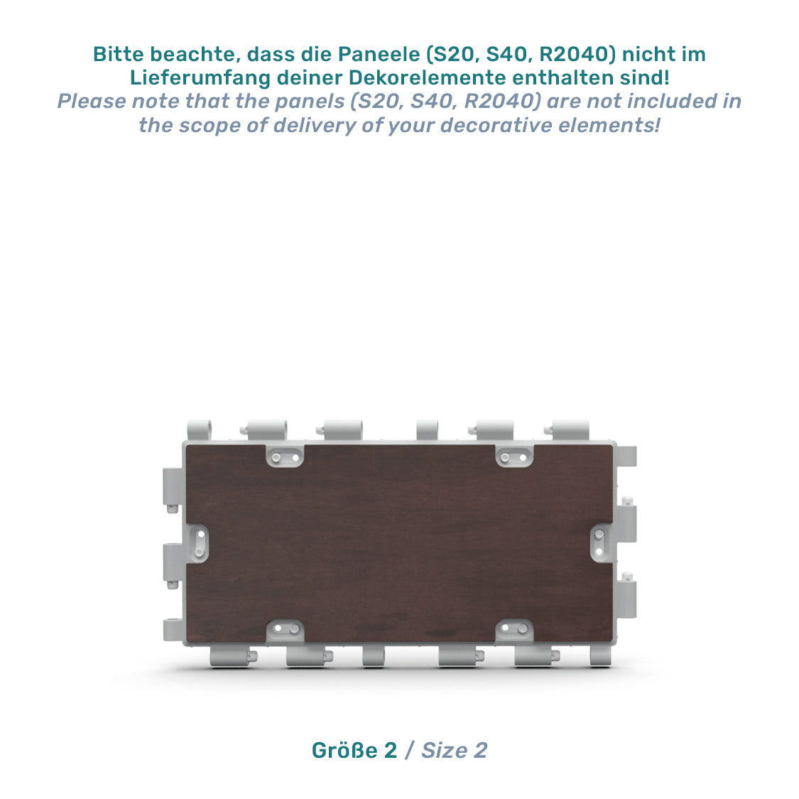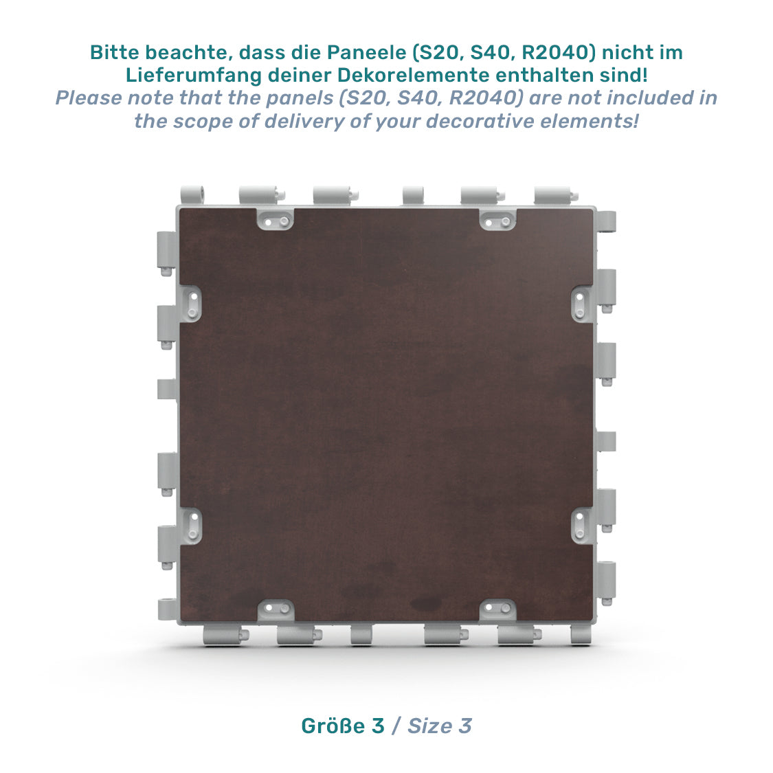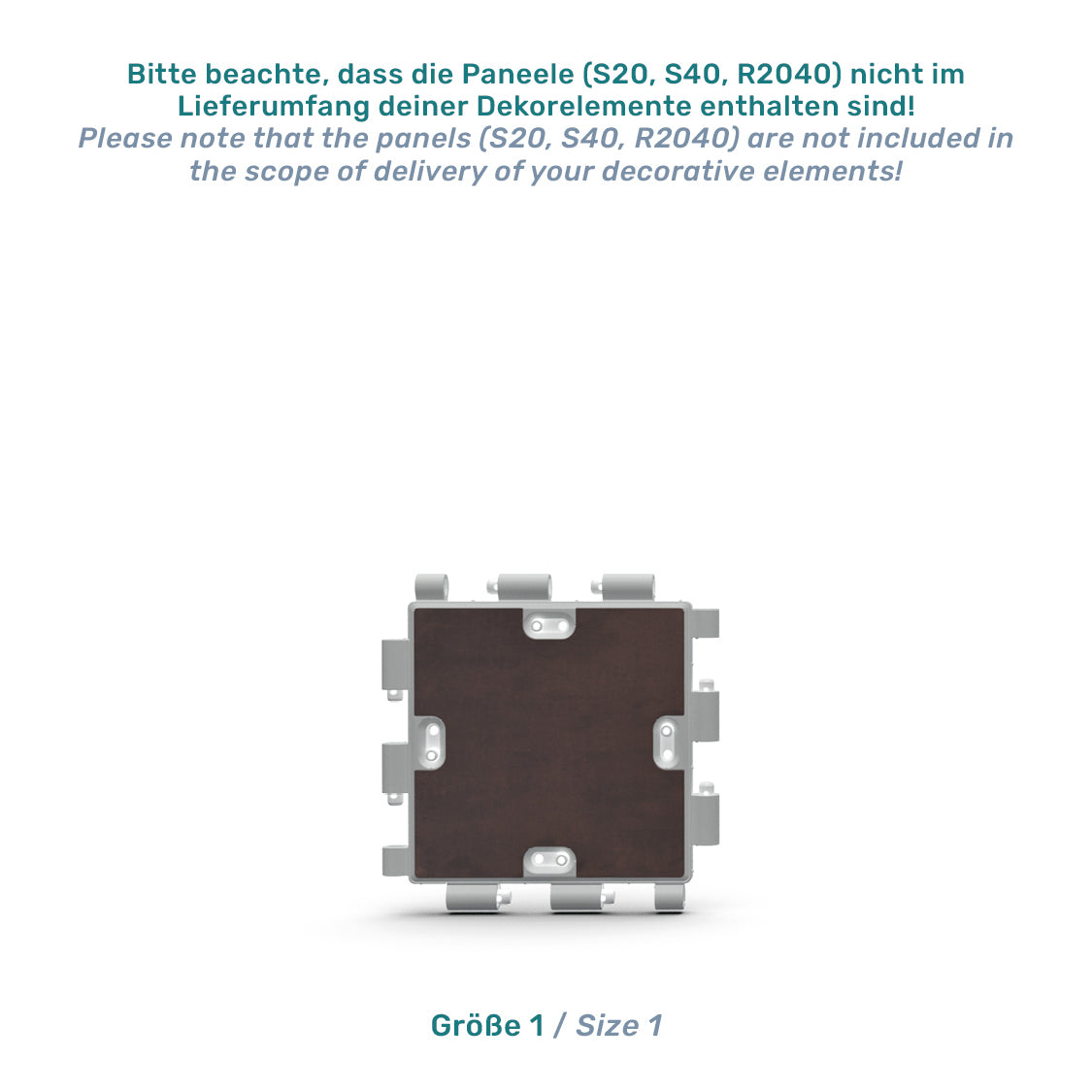 Dieses Dekorelement ist ausschließlich für unsere S20-Paneele geeignet. Das neue, universelle Dekorelement, das mit allen Paneelgrößen (S20, S40, R2040) kompatibel ist, findest du ebenfalls in unserem Shop.